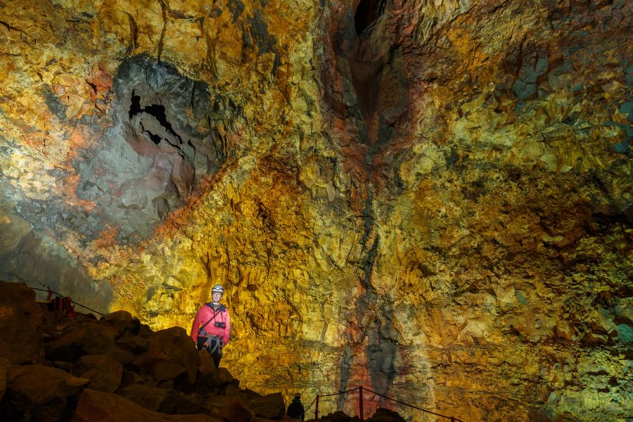 Unique au monde et uniquement en Islande : descendez au cœur du volcan dormant Þrihnúkagigar, qui est entré en éruption il y a plus de 4000 ans. Après une impressionnante randonnée de 45 à 50 minutes à travers un champ de lave, vous descendez au fond du cratère, 120 mètres plus bas, grâce à un téléphérique ouvert. Vous pouvez ensuite passer 40 minutes à explorer la chambre magmatique, très profonde et colorée.