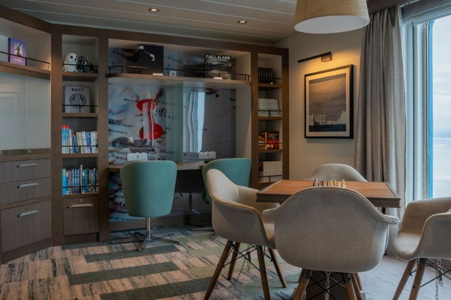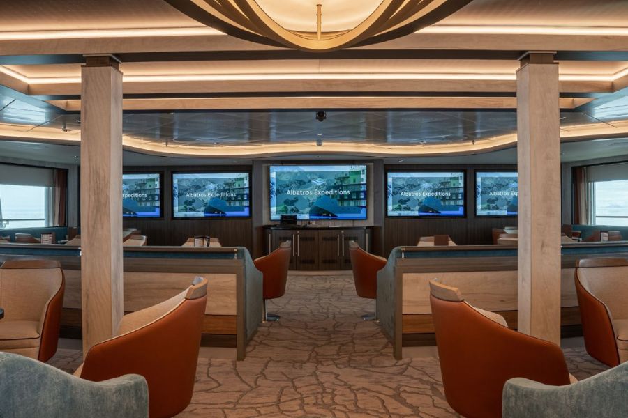Dans la salle de conférence, vous en apprendrez davantage sur les régions explorées durant le voyage. L’équipe de l’expédition y donne des conférences sur de nombreux sujets, mais vous pouvez également vous plonger dans la bibliothèque spécialisée ou poser des questions supplémentaires.